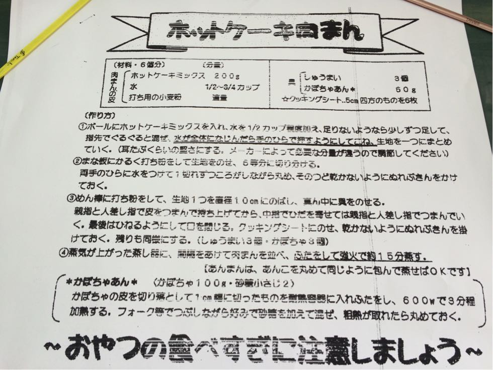 家庭科の時間にシュウマイとホットケーキミックスを使って、肉まんを作りました。
