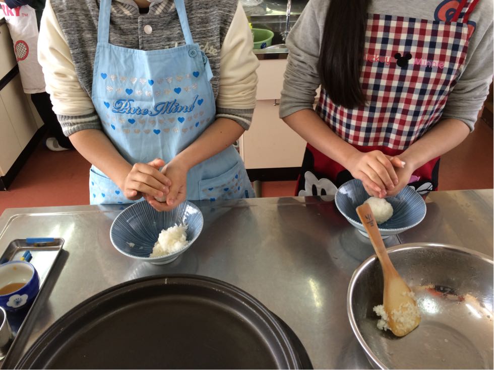 今日は、1組がおにぎり作りをしています。手つきもなかなか上手です。