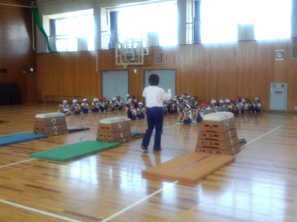 今日体育の授業を支援していただく廣田先生が来られて、跳び箱の授業を行いました。