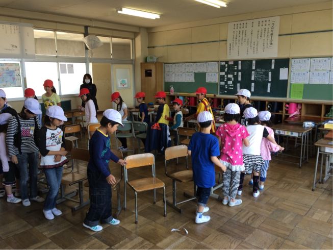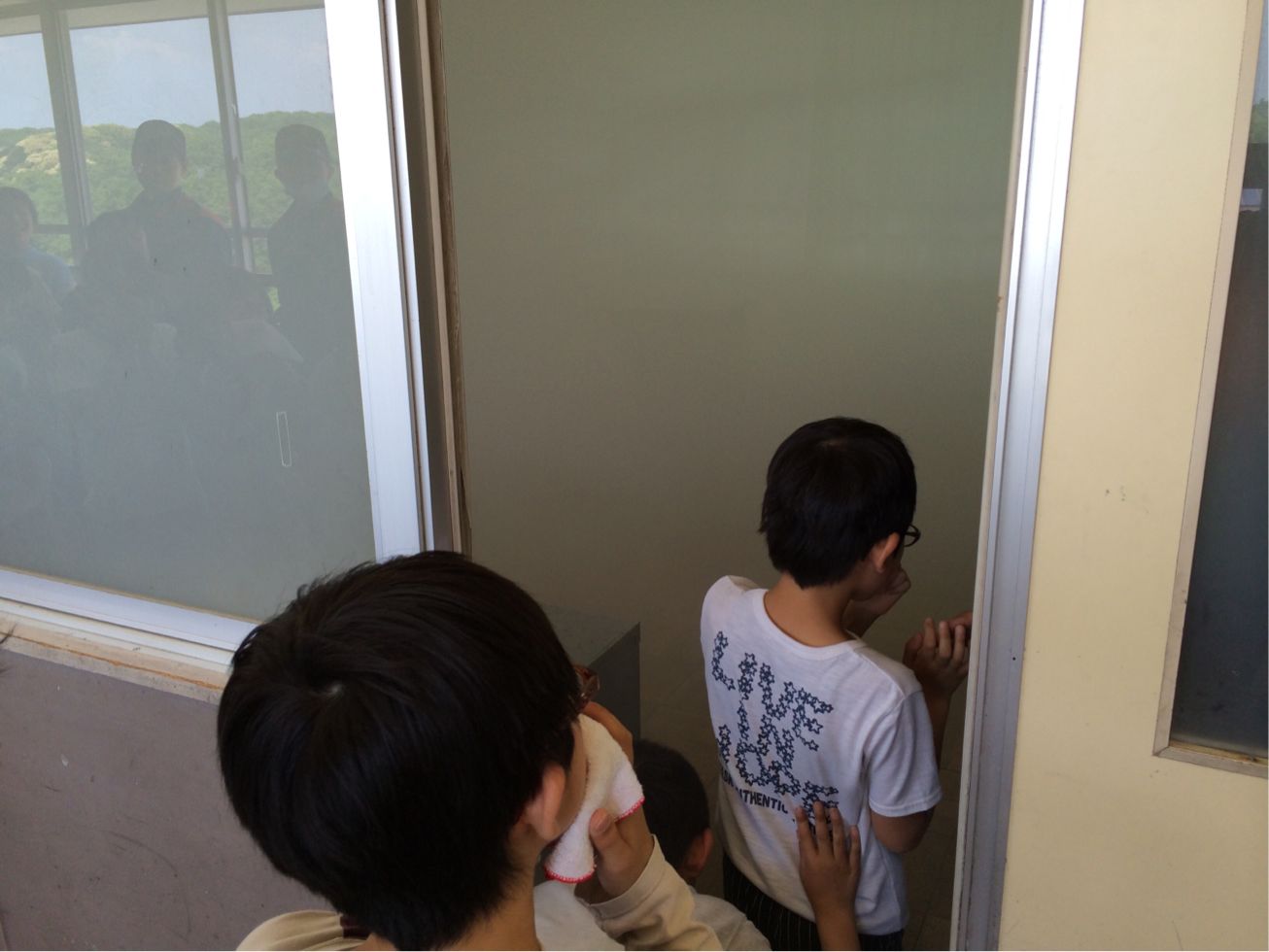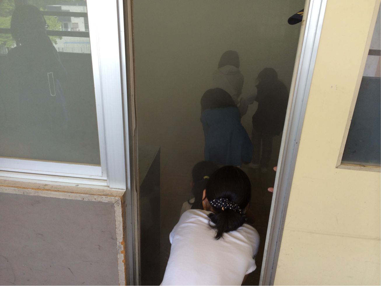 避難訓練の後、56年生が煙の充満した部屋がどんな様子なのか体験しました。