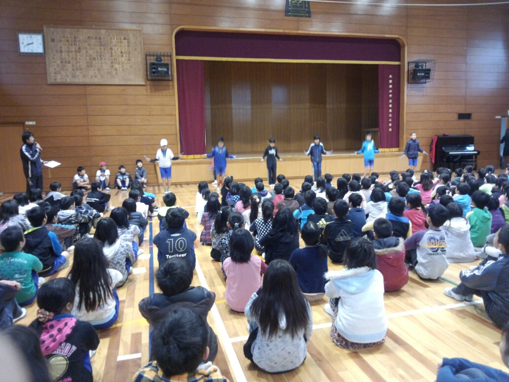なわとびタイム月間にとりくんでいます。今朝は体育委員会の子どもたちが、いろいろな跳び方の紹介をしてくれました。