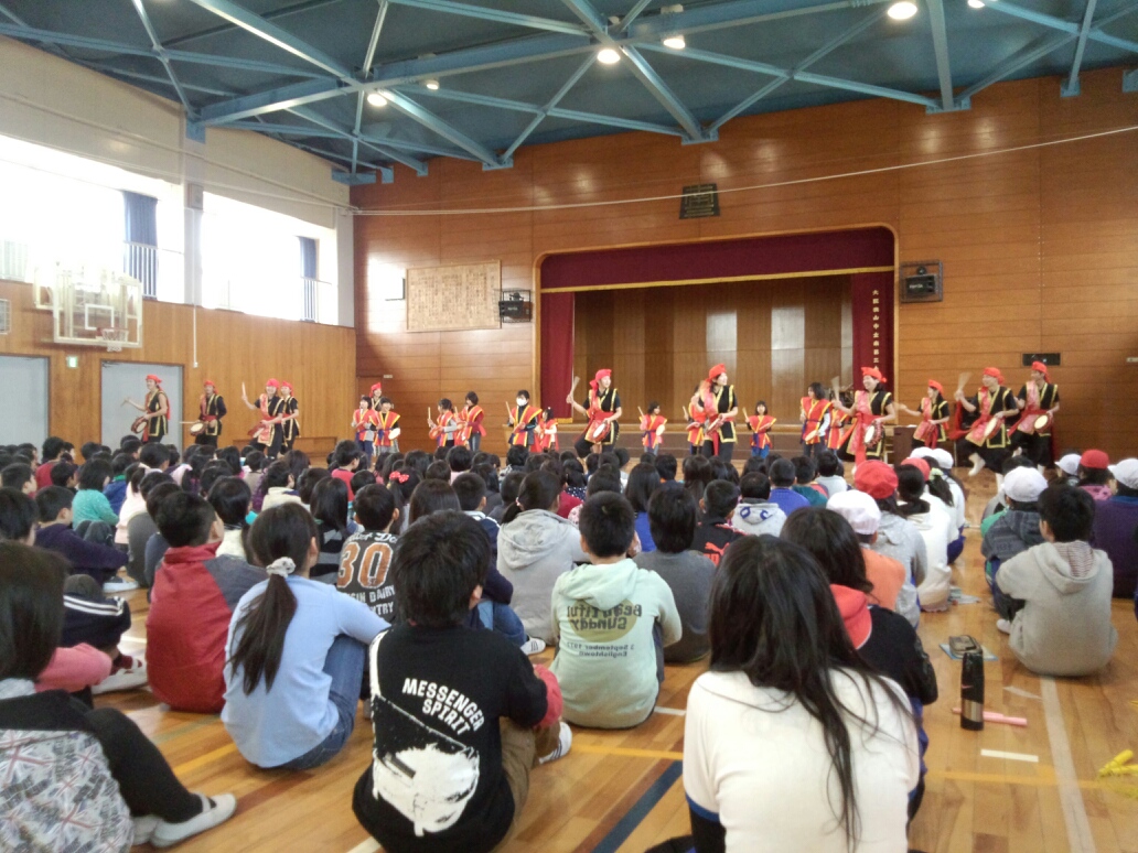 今朝の朝会で、元気っこクラブのエイサーの発表会が行われました。エイサーとは沖縄の舞踊だそうです。