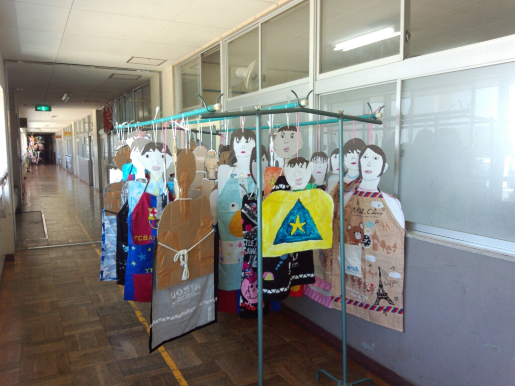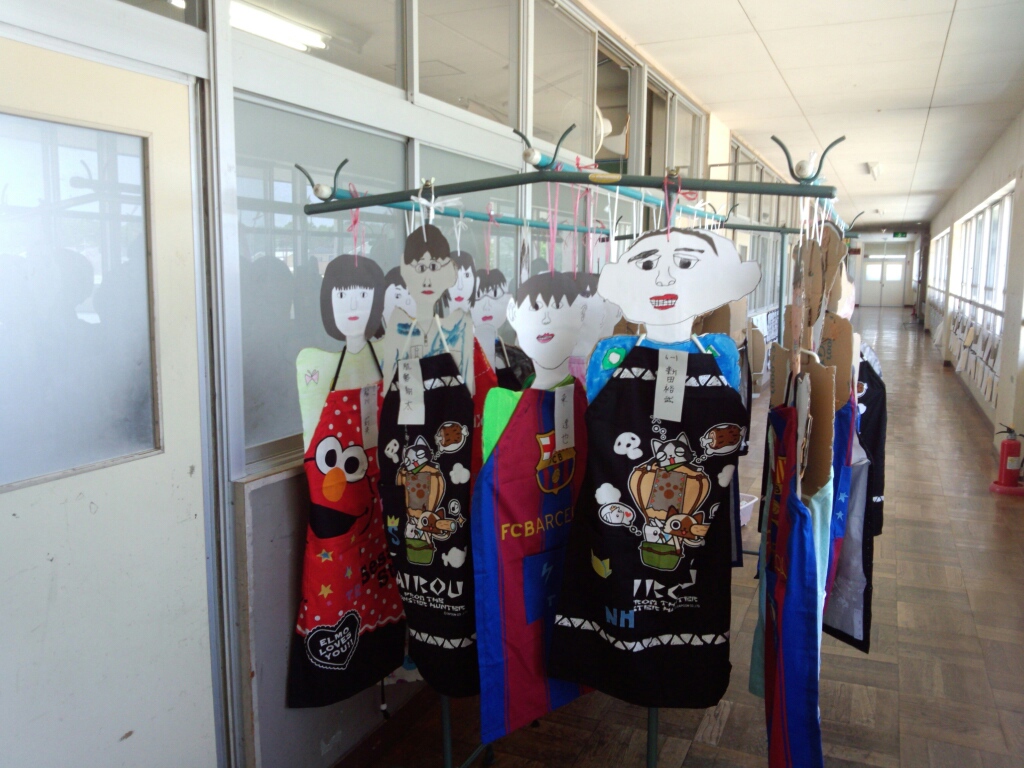 家庭科の作品がかざられていました。かわいいエプロンたち