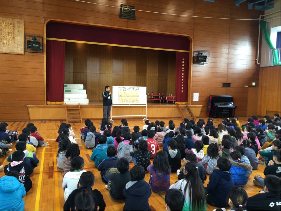 朝会では、校長先生、児童会の人たち、生徒指導部の先生から冬休みの過ごし方についてお話がありました。