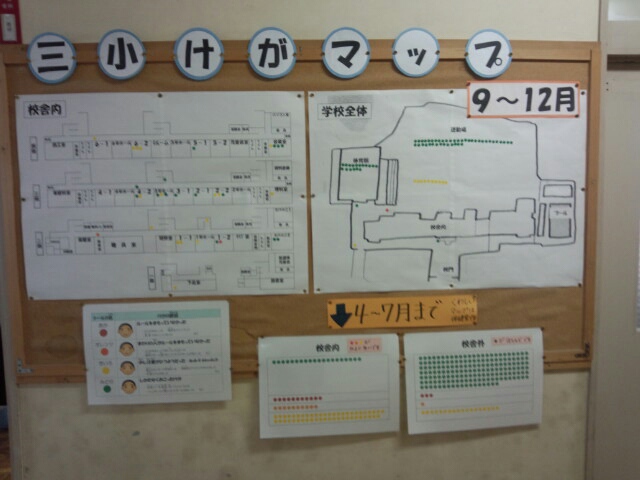 校長室の前の掲示板に、新谷先生が作ったけがマップ貼られています。本校で発生したけがを分析し、学校の地図に発生場がシールで示めされています。