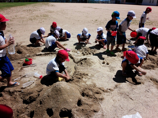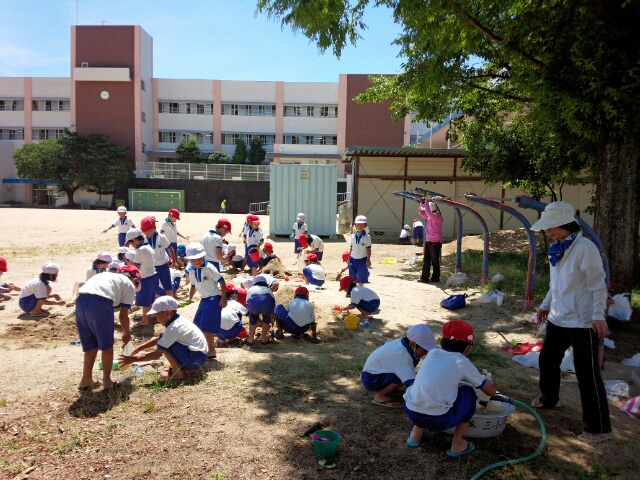 1年生が砂場で泥んこ遊びをしています。