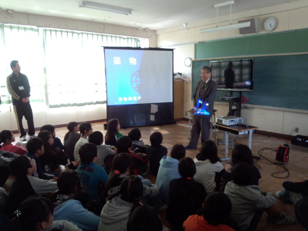 薬物乱用防止教室で元麻薬取締官のお話を聞く児童たち