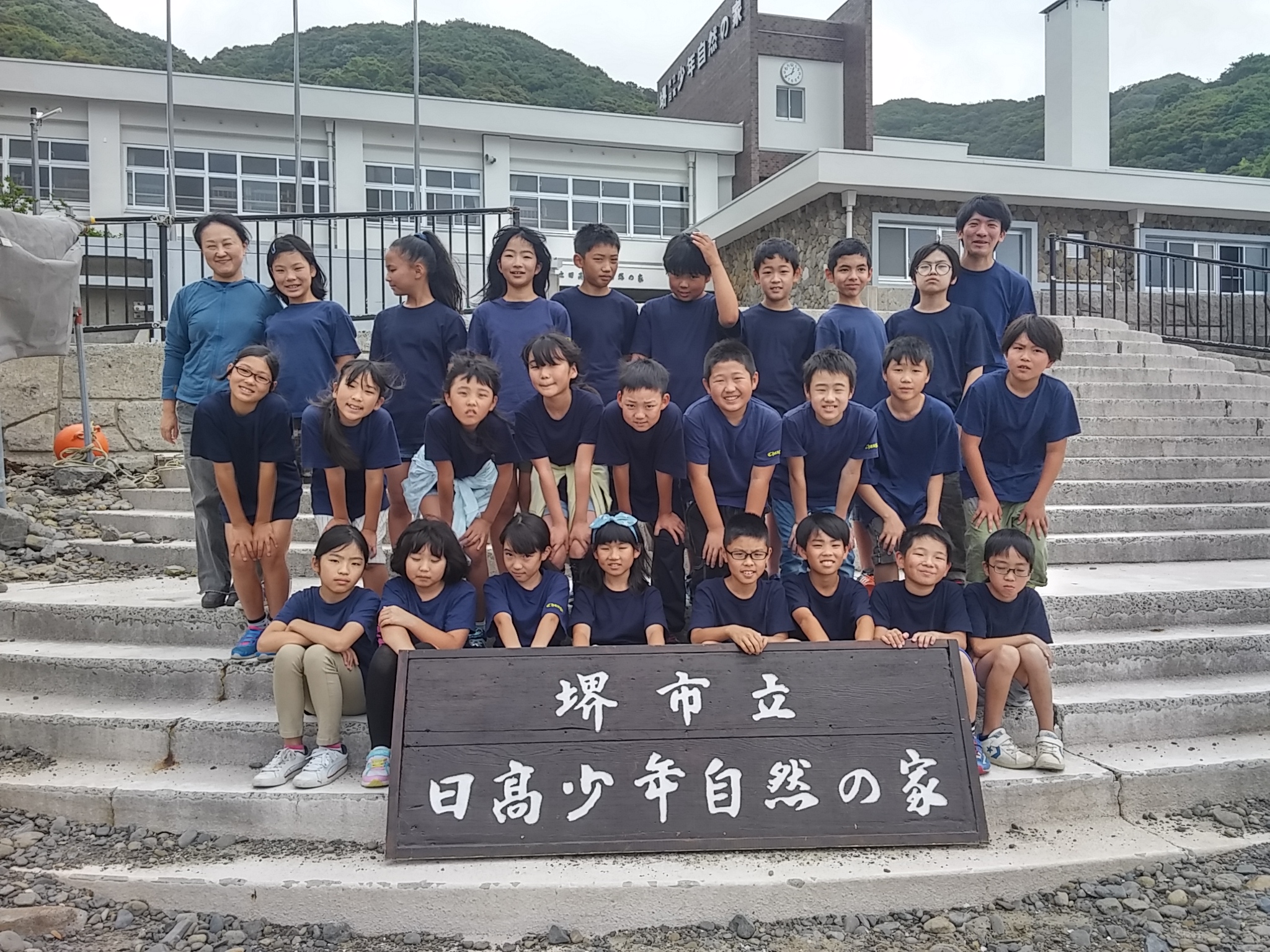 無事に「日高少年自然の家」に到着し、クラス写真を撮りました。雨はやみましたが、少し波が高いです。
