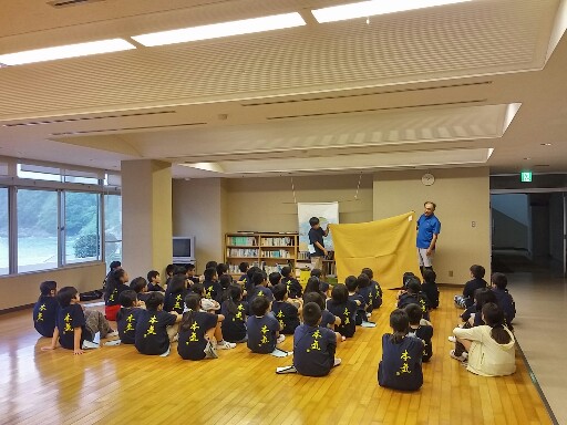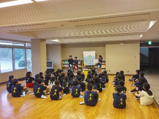波の音を聞きながらの入館式です。係の人の紙芝居の後、施設の方に活動中に気を付けることなどの説明を聞きました。