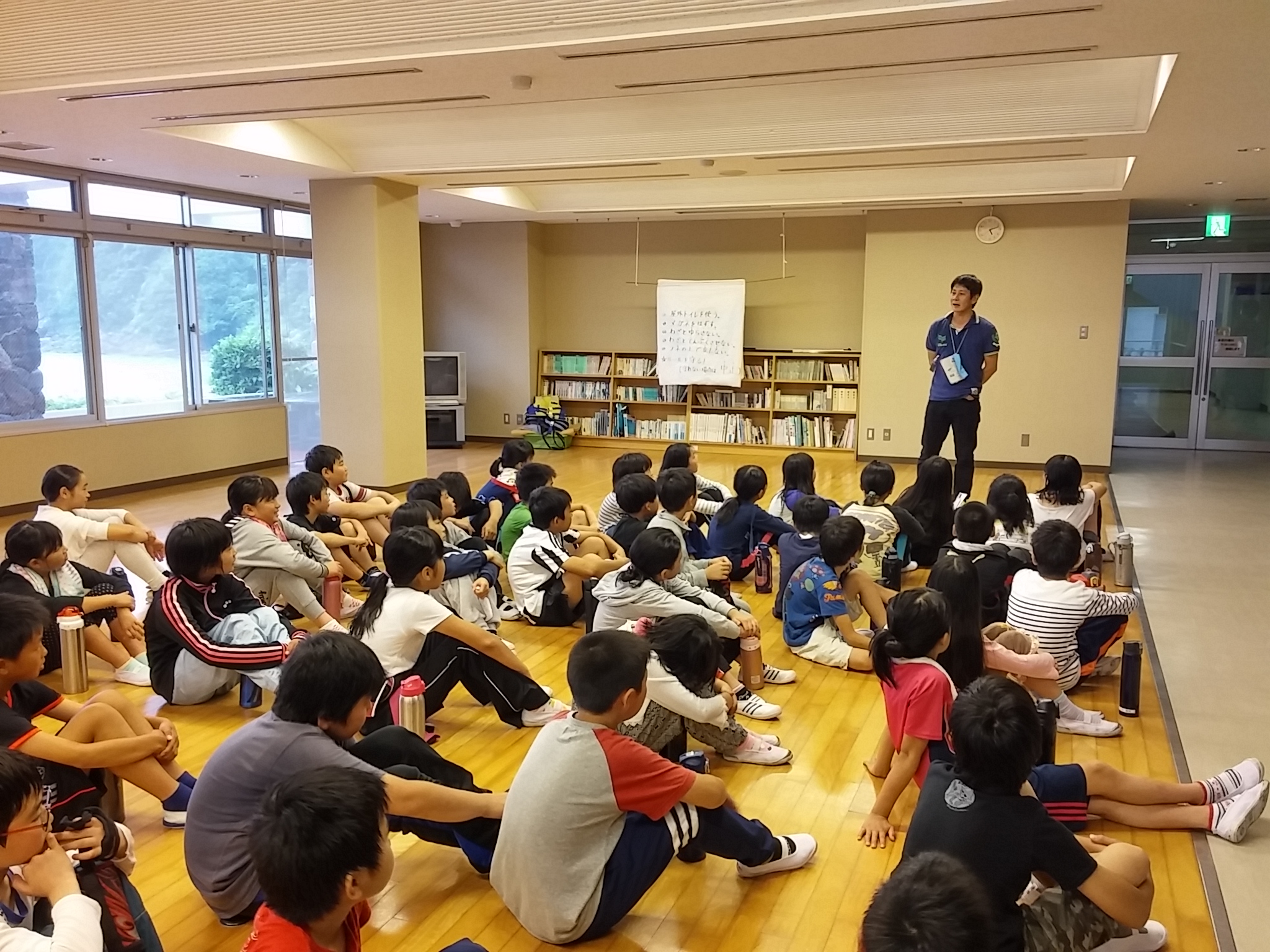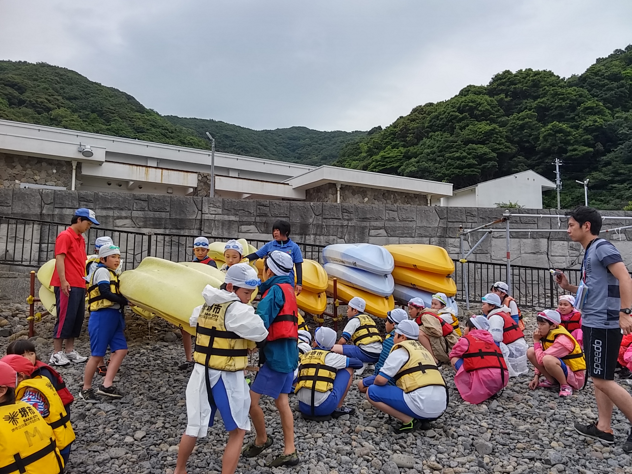 海の活動は雨が激しくなってきたので、少し早目に終わりました。お風呂で温まり、食事前に多目的ホールでクラス写真を撮り、クイズをしたり目良先生の楽しい話を聞いたりしました。